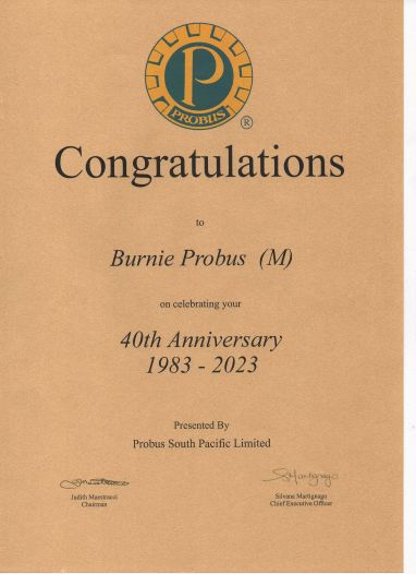 Burnie Probus celebrated forty years of active life. At the club’s anniversary dinner, the Mayor of the City of Burnie, Teeny Brumby, presented the club with this Certificate of Congratulations from Probus South Pacific.